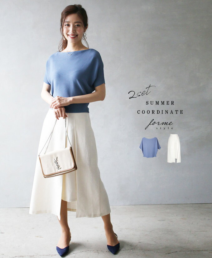 清涼感のある大人のキレイめコーデ「forme」ボトムス 春 夏 秋 ブルー 青 水色 アイボリー クリーム 白 トップス ニットソー カットソー 半袖 トップス スカート フレア ボートネック 2点セット コーデ コーディネート