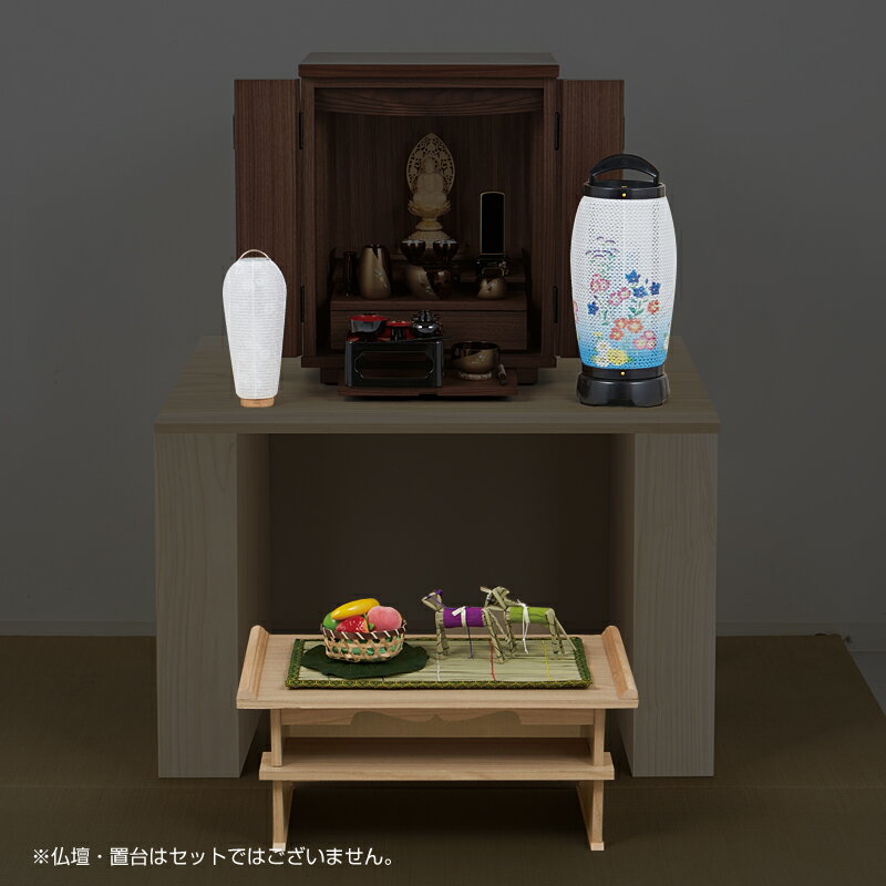 ●小珠(こだま)紋天×1 サイズ:高25×火袋径10cm 素材:プラスチック・紙 火袋・柄:紙張 白紋天 照明仕様:コードレス電池灯(LC301) ●回転 せいらん 1号×1 サイズ:高41×火袋径18cm 素材:プラスチック・紙 火袋・柄:紙張・レース 桔梗に撫子 照明仕様:100V、25W電球(E17)、回転筒(青・水玉) ●経机×1 サイズ:高60×奥行35×幅26.5cm ●心まちセット耳無 S-1×1 心まち真菰 耳無 45×24 心まちセット用 麻がら 45cm 10本 ハスの葉(特上) 心まち牛馬 心まちセット用縄1.2m ●くだもの盛篭×1 ●仏膳5.5寸黒×1 こちらの商品は、のし・ラッピングをお付けすることができません。